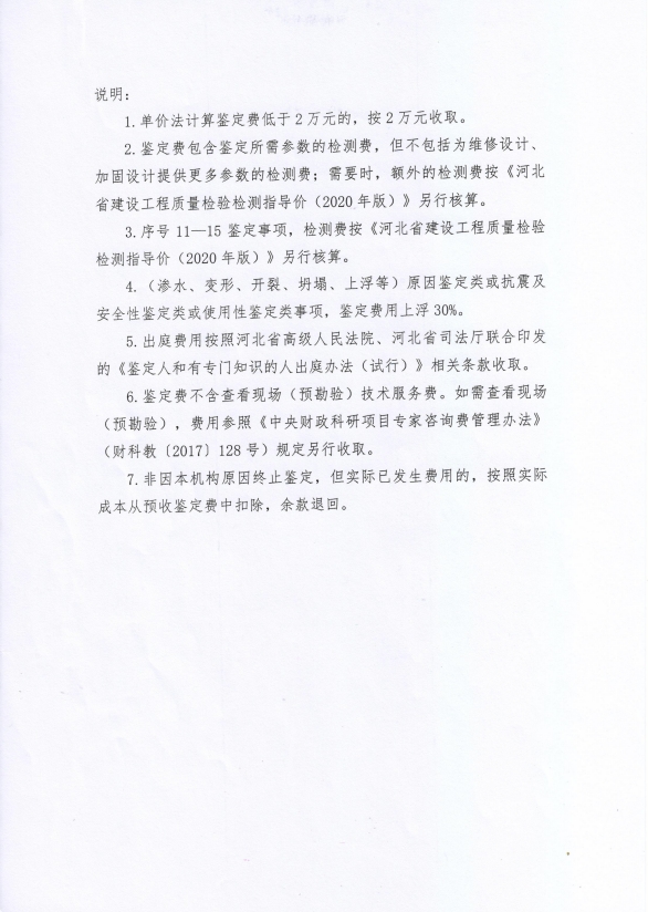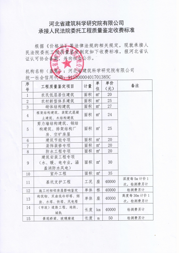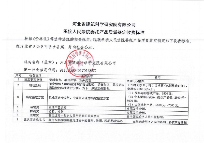 根據(jù)《河北省認證認可協(xié)會產(chǎn)品質(zhì)量鑒定管理辦法(試行)》第36條、《河北省認證認可協(xié)會工程質(zhì)量鑒定管理辦法(試行)》第35條“目前國家物價管理部門未對工程質(zhì)量鑒定收費進行統(tǒng)一定價,鑒定機構(gòu)應(yīng)當(dāng)公示本機構(gòu)收費標(biāo)準(zhǔn)”之規(guī)定,我公司參照財政部財科教【2017】128號《中央財政科研項目專家咨詢費管理辦法》中的有關(guān)規(guī)定,并結(jié)合我公司產(chǎn)品質(zhì)量鑒定和工程質(zhì)量鑒定中鑒定專家工作的實際情況,制定了《河北省建筑科學(xué)研究院有限公司產(chǎn)品質(zhì)量鑒定/工程質(zhì)量鑒定收費標(biāo)準(zhǔn)》(見附件)?,F(xiàn)予以公示。