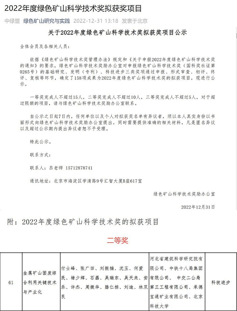 我公司申報的“金屬礦山固廢綜合利用關(guān)鍵技術(shù)與產(chǎn)業(yè)化”項目依據(jù)《綠色礦山科學(xué)技術(shù)獎管理辦法》規(guī)定和《關(guān)于申報2022年度綠色礦山科學(xué)技術(shù)獎的通知》的要求,經(jīng)綠色礦山科學(xué)技術(shù)獎勵辦公室對申報綠色礦山科學(xué)技術(shù)獎(國科獎社證第0265號)的基礎(chǔ)研究、發(fā)明(專利)、科技進(jìn)步三類獎項通過申報、形式審查、初評、終評、復(fù)核等環(huán)節(jié),確定我公司申報的“金屬礦山固廢綜合利用關(guān)鍵技術(shù)與產(chǎn)業(yè)化”榮獲2022年度綠色礦山科學(xué)技術(shù)獎二等獎。
